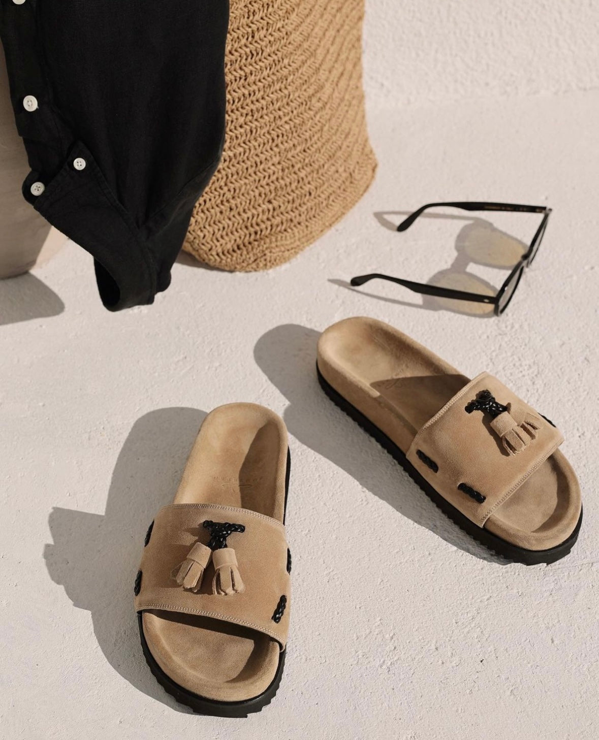 Ready for adventure. Made with its perfect fit to footprint footbed and premium Italian suede our tassle slider represents a contemporary approach to luxury.